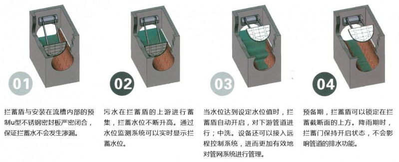 閑置期間,攔蓄門可以鎖定在攔蓄截斷面的上方,不占用管道任何排水空間。雨季時,攔蓄門保持開啟狀態,不會影響管道的排水功能。斷電時,亦可保持開啟狀態。
