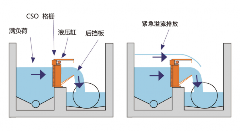 RSW型水平溢流格柵是其中常用的一中簡(jiǎn)單而有力的合流制管網(wǎng)溢流格柵。它安裝在溢流口的混凝土堰上,水流水平橫向通過(guò)格柵,主要功能是用來(lái)阻止漂浮、懸浮、不可生物降解及固態(tài)雜質(zhì)的流出,確保任何大于4mm尺寸的雜質(zhì)在入流處被篩選掉,從而不會(huì)干擾到溢流排放過(guò)程,篩渣和固體雜質(zhì)保留在柵網(wǎng)前端,從而進(jìn)入后續(xù)的污水管。格柵通過(guò)電控液壓系統(tǒng)控制柵條間隙清洗刷來(lái)回運(yùn)動(dòng)實(shí)現(xiàn)自清洗,當(dāng)堵塞發(fā)生的時(shí)候,控制系統(tǒng)通過(guò)清洗刷在堵塞位置反復(fù)運(yùn)動(dòng)直至堵塞清除。格柵背部設(shè)置后擋板來(lái)保證過(guò)柵水流均勻且至大流速不超過(guò)1.5m/s。格柵上方為緊急溢流排放口,當(dāng)格柵自清洗系統(tǒng)失效或者格柵超載的時(shí)候,水流可以從格柵上部的緊急溢流口通過(guò)。