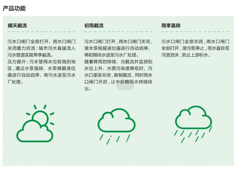 針對目前合流制管道污水直排,分流制管道中存在混接污水,初期雨水溢流污染導致河道水體黑臭的問題,海辰開發了一體化智慧截流提升井。通過在線監控系統,將晴天污水與初期雨水截流至污水管網中,后期雨水分流至雨水管網或河道中,實現“晴天截流,初雨截流,雨季直排”的功能。一體化智慧截流提升井能夠完成截污納管的工作,在解決城市黑臭水體問題方面起到突出的作用。